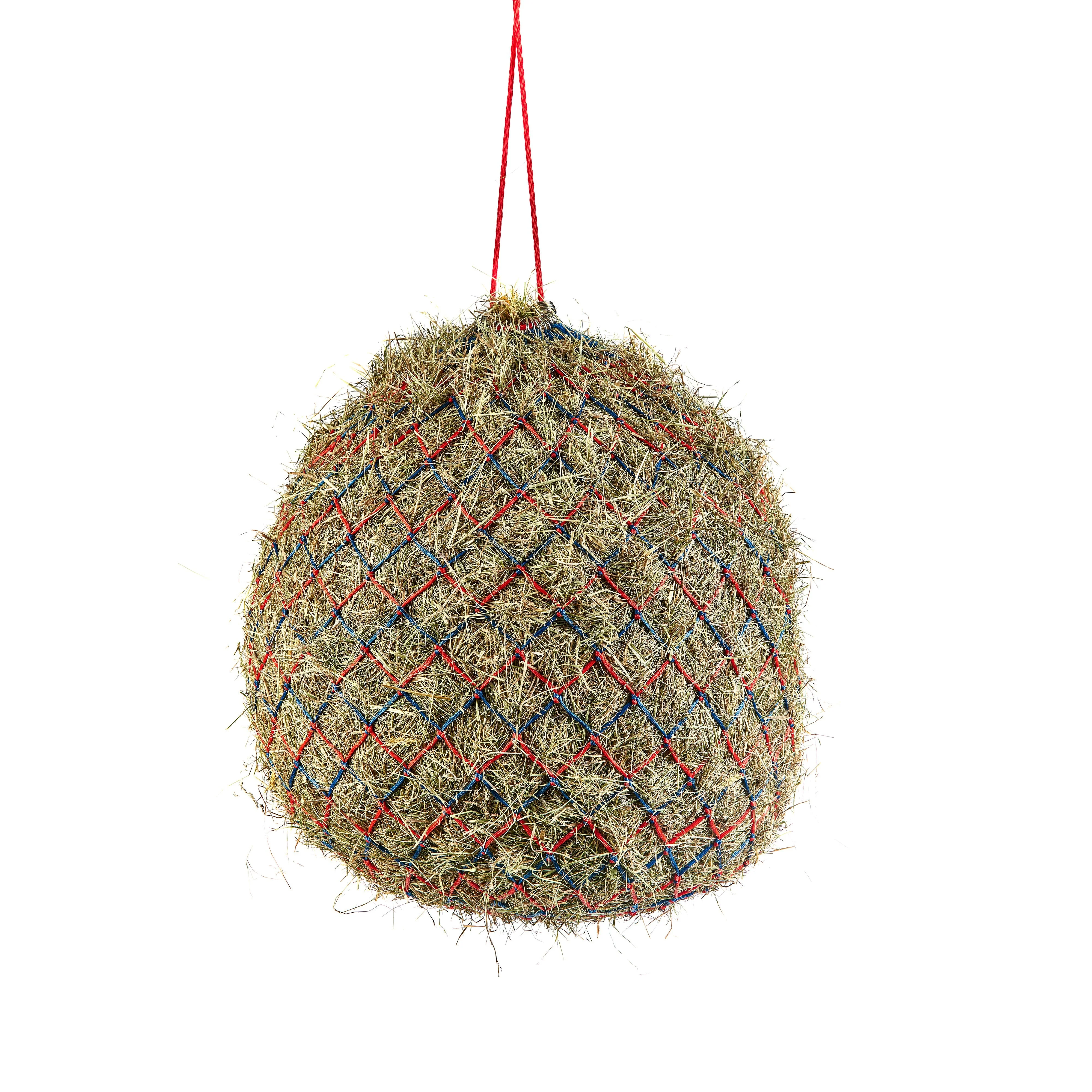 Extra strong Shires haylage net with a large ring at base, strong hanging rope and small holes to make forage last longer. Suitable for haylage or for controlled feeding of hay. Mesh Size: 4.5cm (1.75"). Small: 36" (92cm) long, capacity: 6.5kg, Large: 45" (115cm) long, capacity: 9.5kg. Mesh size can be +/- 0.5cm. Capacities are approximate and given only as a guide to the differences between haynet size.