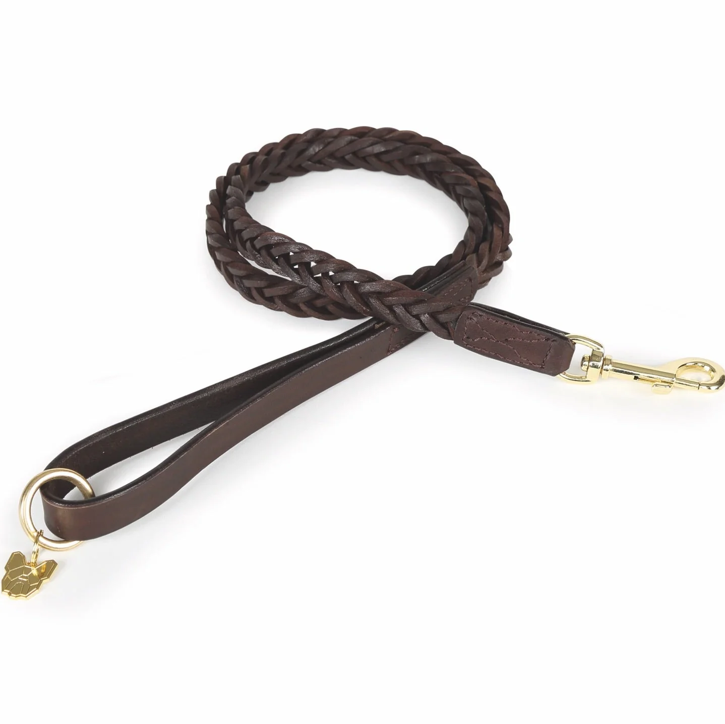 Plaited leather for distinctive style with an elegant twist. This beautifully finished leather dog lead features a swivel trigger clip to stop the lead becoming twisted. Flat leather handle, brass buckle and D-ring, Digby & Fox tag. Matching collar available.