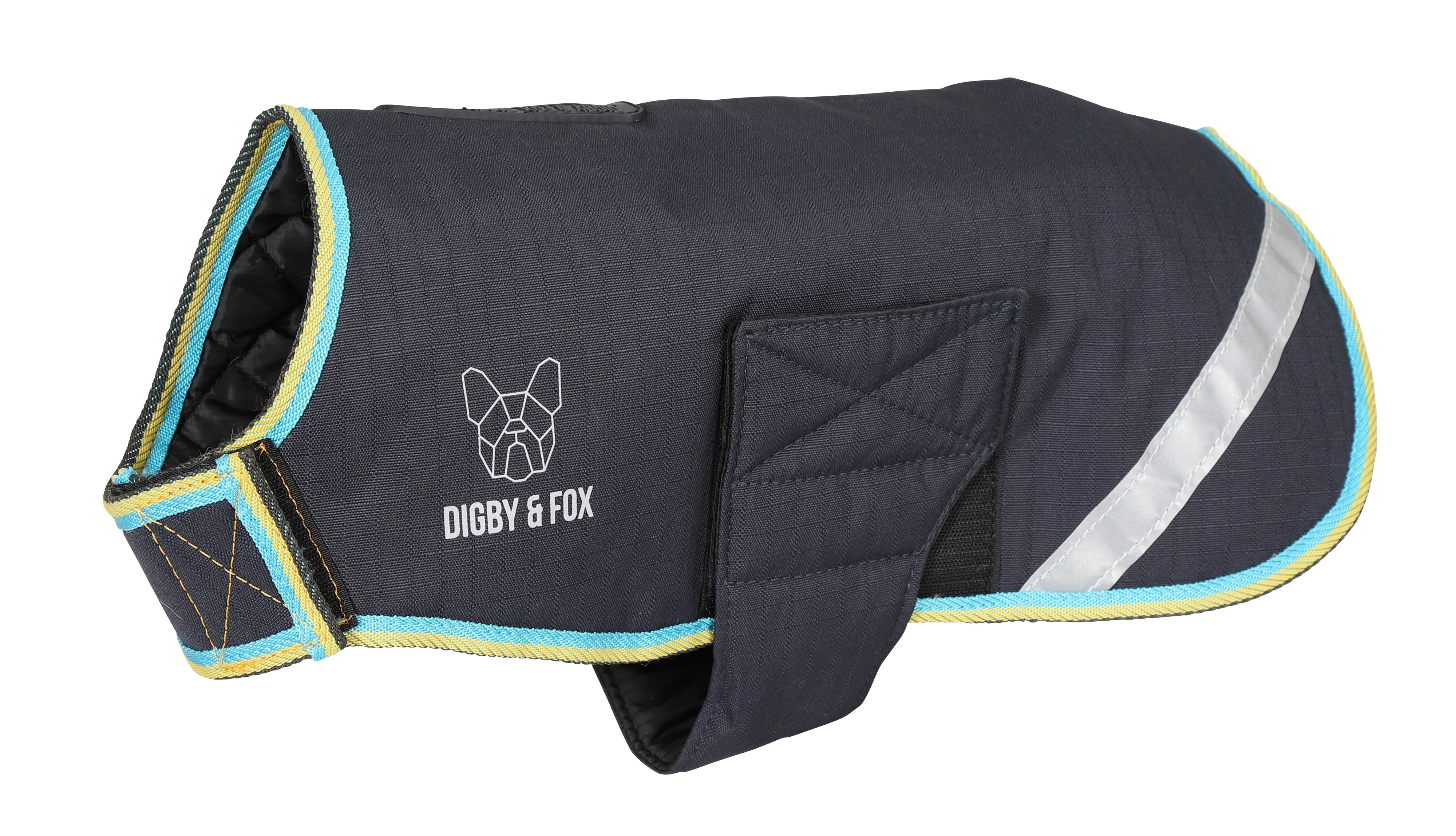 Get out there and embrace those rainy-day walks! The waterproof outer and insulated lining of this harness compatible dog coat will keep your four-legged friend warm and dry whatever the weather. Taped seams, 200gsm fill, breathable lining, reflective side strips, touch and close chest and belly fastenings, elasticated leg straps, contrast trims, Digby & Fox detailing.